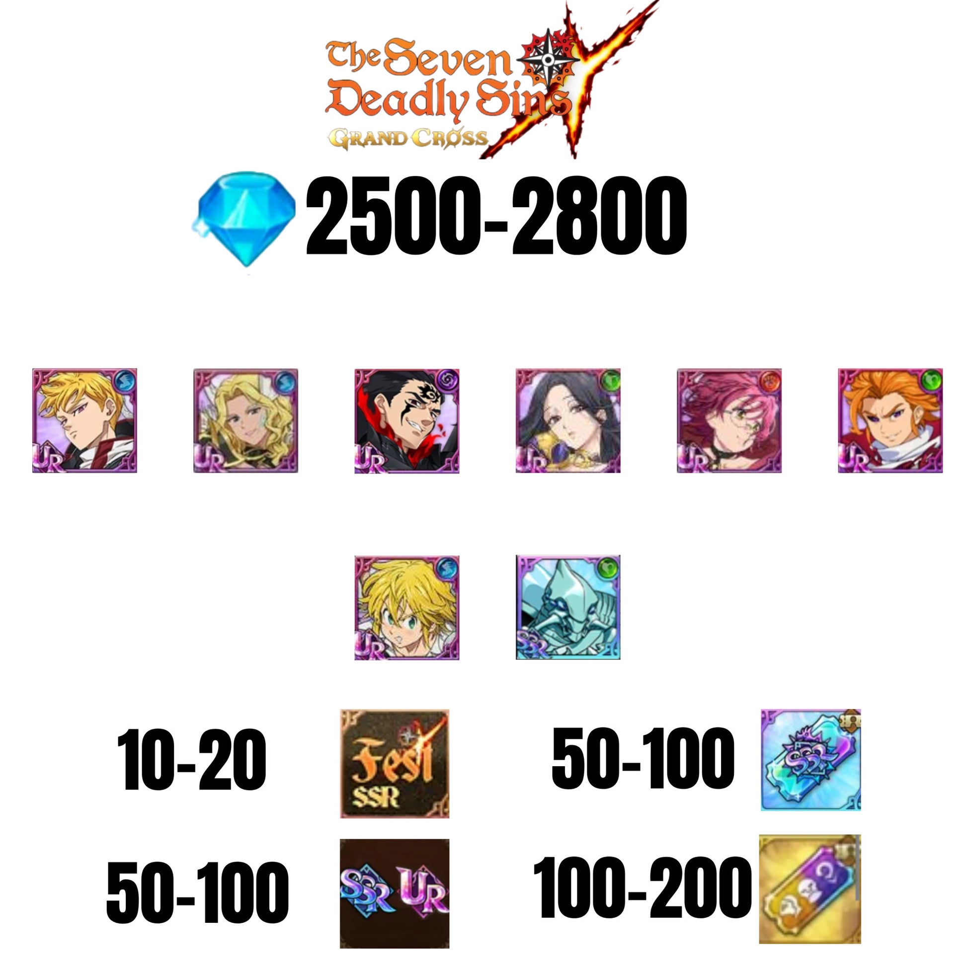 [GLOBAL] 2500-2800 GEMS | ZELDRIS DEMON KING NEW | SKULD | ARTHUR | THOR | MELIODAS DEMON KING | GOWTHER UR | LANCELOT | COCTYUS | 10-20 FEST | 30-70 UR/SSR | 50-100 TICKET SSR